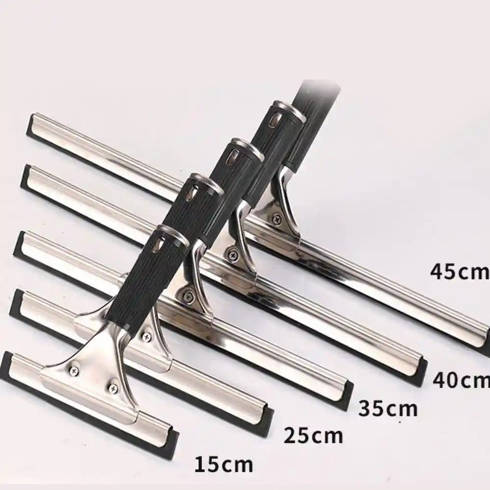 The handle and support frame are manufactured from stainless steel, providing resistance to corrosion in wet and humid cleaning environments. The squeegee blade is formed from durable elastomer material to maintain consistent contact with smooth floor surfaces.